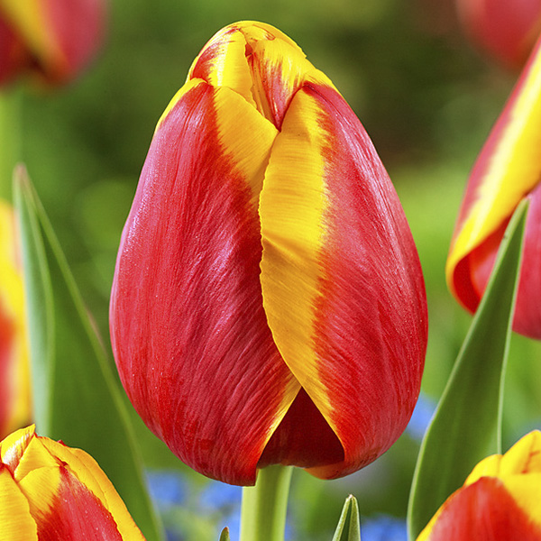 Тюльпан Kees Nellis – один из самых выразительных сортов класса Triumph, поражающий контрастом тёплых оттенков. Его бутоны окрашены в насыщенно-красный цвет с широкой ярко-жёлтой полосой, проходящей вдоль края лепестков. Такой рисунок создаёт эффект живого пламени, особенно на солнце – лепестки словно светятся изнутри. Классическая бокаловидная форма и прочные стебли делают сорт незаменимым для оформления клумб, бордюров и создания весенних букетов.